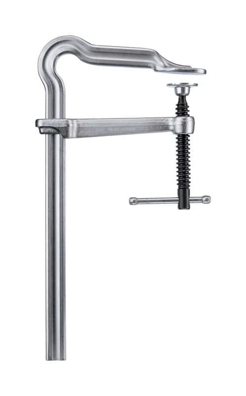 The patented “OMEGA” bend RSC series clamps are designed to resist vibration by adding a lateral load to the spindle. This pervents the clamp from being tightened via a threaded spindal mechanism from loosening when subjected to extended periods of vibration and will maintains it’s positive clamping presure. It is durable, lightweight and easy to use. Like all clamps in the premium line these are made out of cold-drawn steel from BESSEY’s own steel mill in Germany. The only clamp manufacturer with quality control from raw material to finished product. The patented OMEGA bend dampens the impact of external vibrations while clamping. Fixed arm and pressure plate produced and tempered from one piece of quality BESSEY steel. The arc of the OMEGA curve enables the rail to hug tightly to the work piece surface allows clamping right into the corner of the clamp Profiles rail of BESSEY precision steel provides stability and strength Sliding steel pin handle