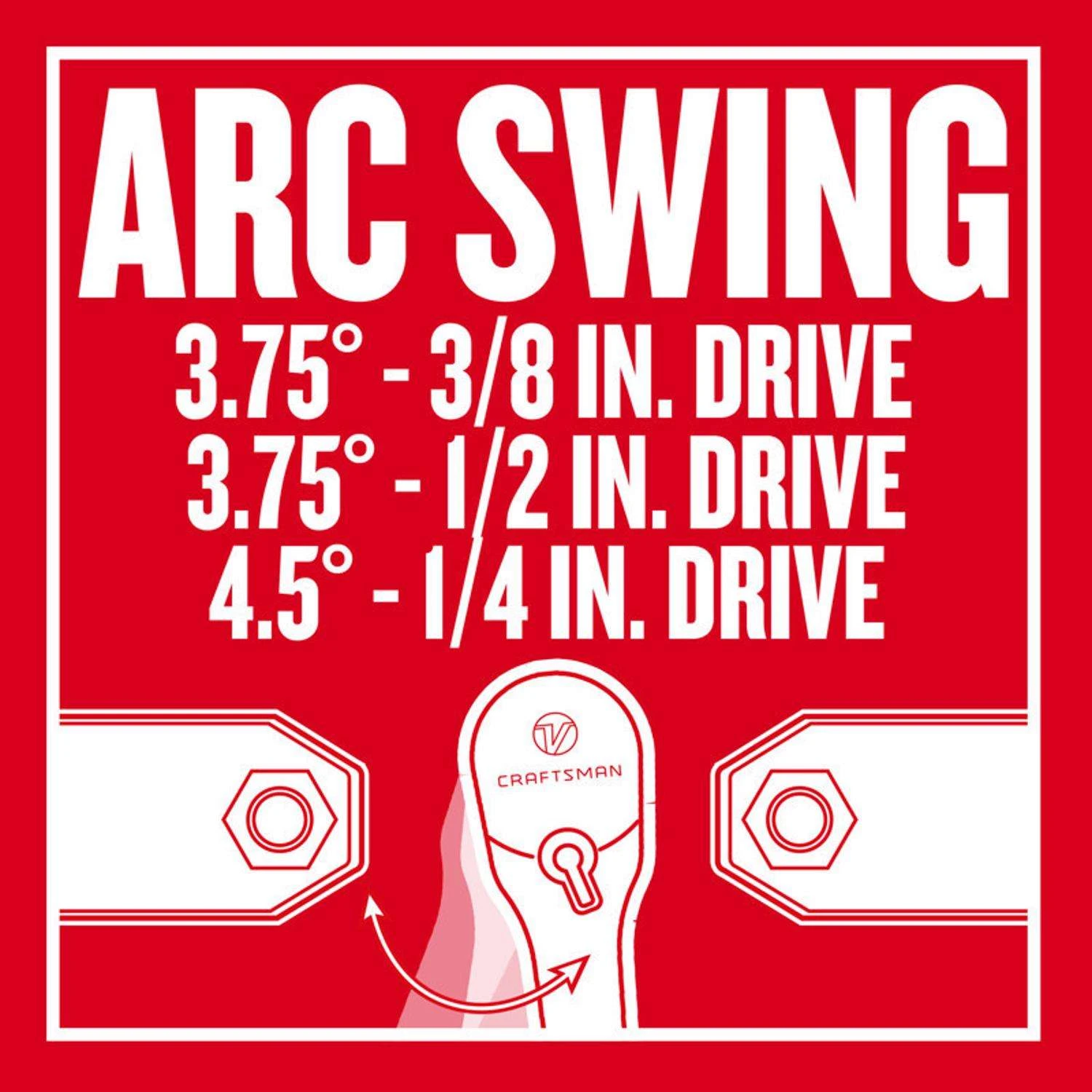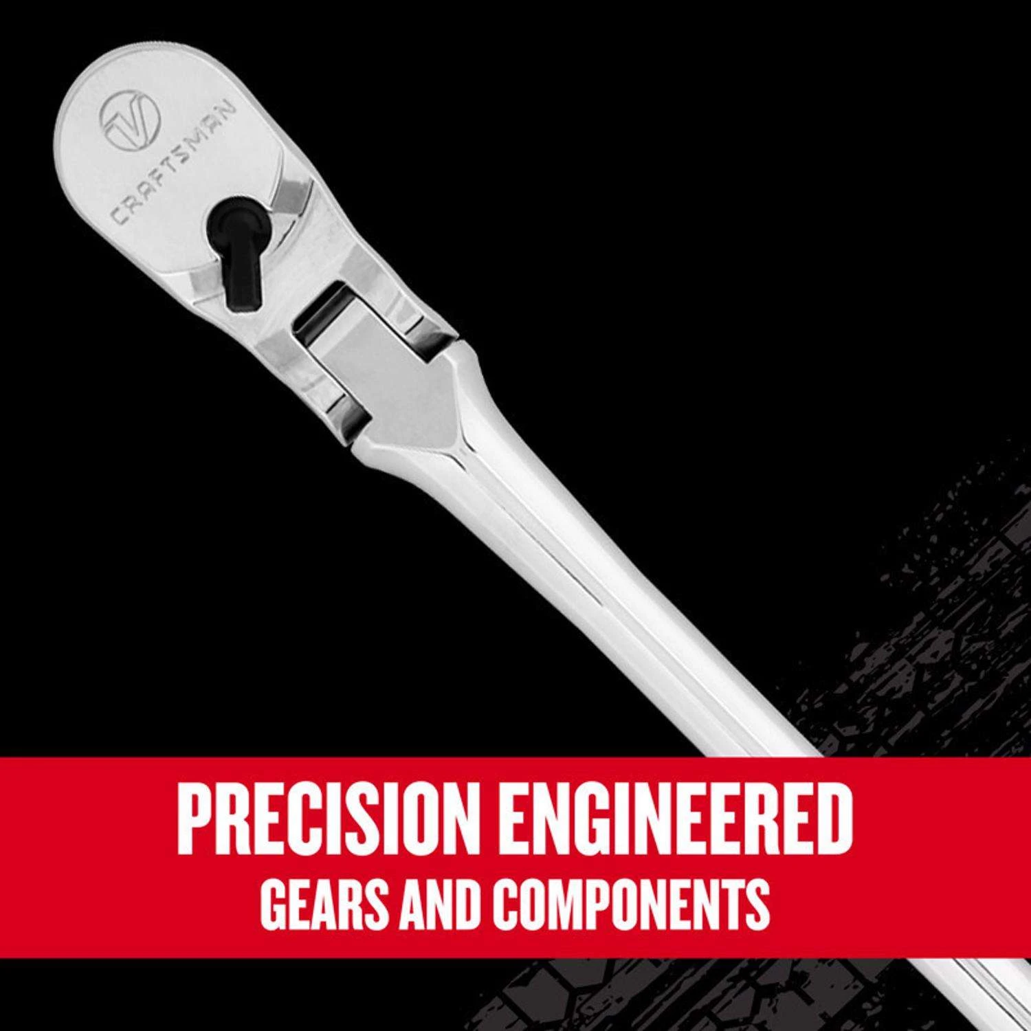 Be ready to take on any project with these V-Series™ 1/4 in., 3/8 in., and 1/2 in. Drive Long Flex Head Ratchets. These ratchets were built for professional-grade performance with a 180° articulating head for greater access to hard-to-reach fasteners compared to standard ratchets. Long life, strength, and durability are delivered by precision-engineered gears and working in confined spaces is made easy with compressed arc swings and optimized grips for strength at any angle. ACCESS CONFINED SPACES: 4-1/2° on 1/4 in. Drive and 3/8 in. Drive, 3-3/4° arc swing on 1/2 in. Drive MAINTAIN PRODUCTIVITY with a 180° Articulating Head that helps you grip hard-to-reach fasteners BUILT FOR STRENGTH AND DURABILITY with precision-engineered gears BACKED BY A LIFETIME WARRANTY: Designed to deliver the quality and durability expected from the CRAFTSMAN brand – if the product fails to perform, we’ll replace it