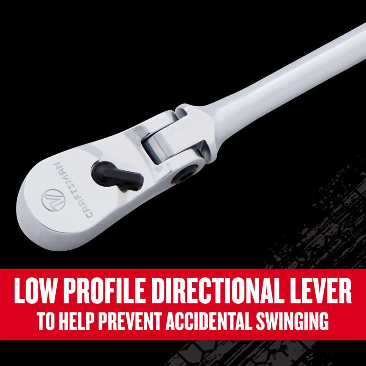 Get the high-end performance you need with this V-Series™ 1/4 in. Drive Comfort Grip Long Flex Head Ratchet. This ratchet delivers durability and dependability for demanding jobs with a precision-engineered gear for enhanced usability. Access hard-to-reach areas with a 4-1/2 arc swing and full grip strength with its 80-tooth design. The enclosed head keeps dirt out of the tool’s interior for long tool life. ACCESS CONFINED SPACES with 4-1/2 deg arc swing MAINTAIN PRODUCTIVITY with a 180 deg Articulating Head that helps you grip hard-to-reach fasteners COMFORTABLE GRIP: Bi-material handle lessens hand strain PREVENT ACCIDENTAL SWITCHING with low-profile directional lever BACKED BY A LIFETIME WARRANTY: Designed to deliver the quality and durability expected from the CRAFTSMAN brand – if the product fails to perform, we’ll replace it