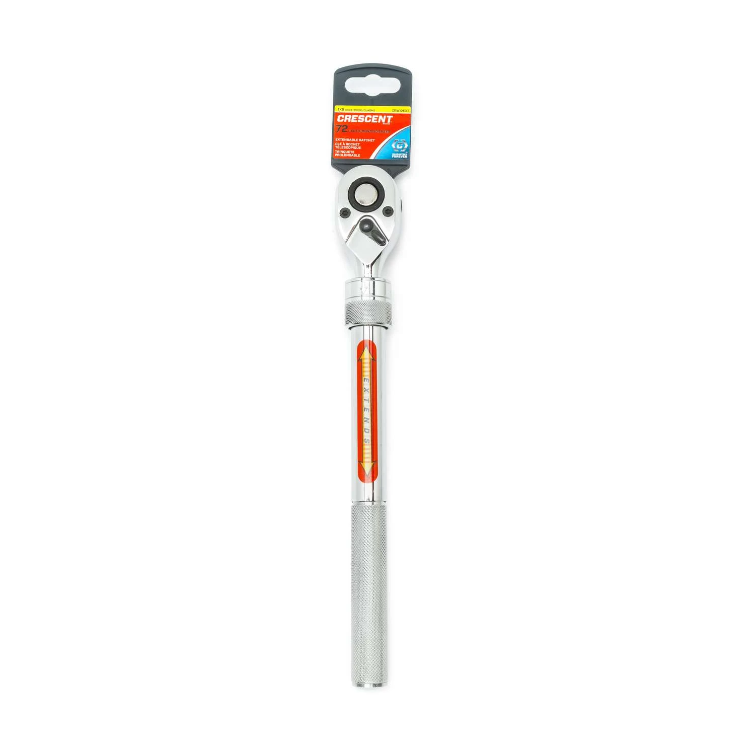 Crescent Extendable 1/2 inch 72 tooth count Ratchet that Extends from 12 inch to 18 inch. This ratchet has a professional style grip on handle and knurl with an Indicator arrows on knurl showing extension function. Quick-release design allows for rapid socket removal Manufactured from chrome alloy steel for better strength and longer tool life Teardrop head for improved access Bright, full polish chrome finish easily wipes clean and resists corrosion 72-tooth ratchet turns fasteners with a 5 deg swing arc Meets or exceeds ASME specifications