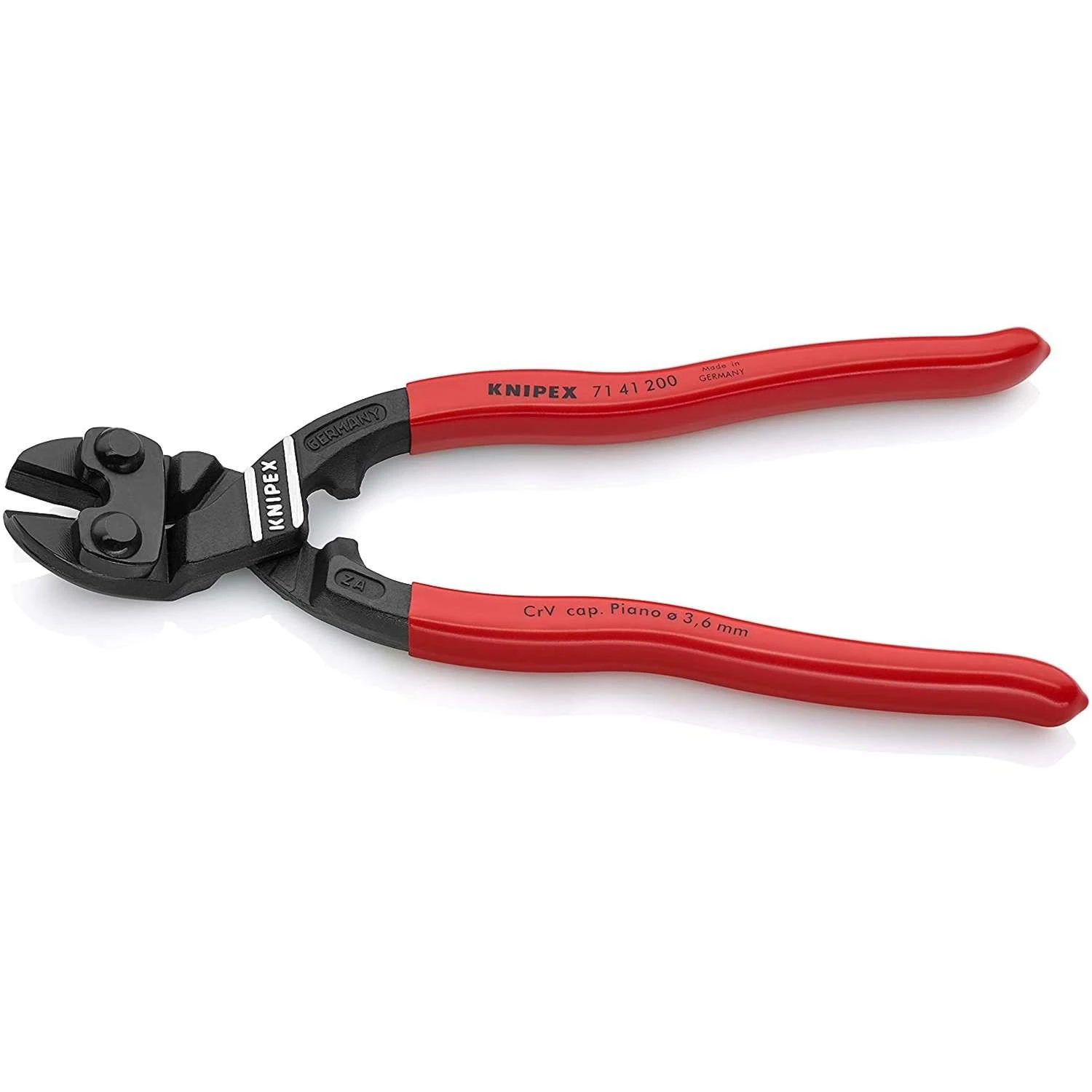 This Knipex high-leverage CoBolt cutter features a lever action design that applies 20 times more hand force for superior cutting power with less effort. This mini bolt cutter can cut through more than you ever thought possible up to 1/4-inch diameter with ease. It’s ideal for automotive or construction applications, cutting cotter pins and nails, repeated use in factory assembly lines, cutting wire fencing in agricultural settings, or even everyday tasks such as cutting floral wire or fish hooks. Precision cutting edges for soft and hard wire as well as piano wire. Black atramentized pliers with plastic coated handle. Most efficient joint design ensures exceptional cutting performance with little effort. Cutting edges additionally induction hardened, cutting edge hardness approximate 64 HRC. Chrome vanadium heavy-duty steel, forged, multi stage oil-hardened.