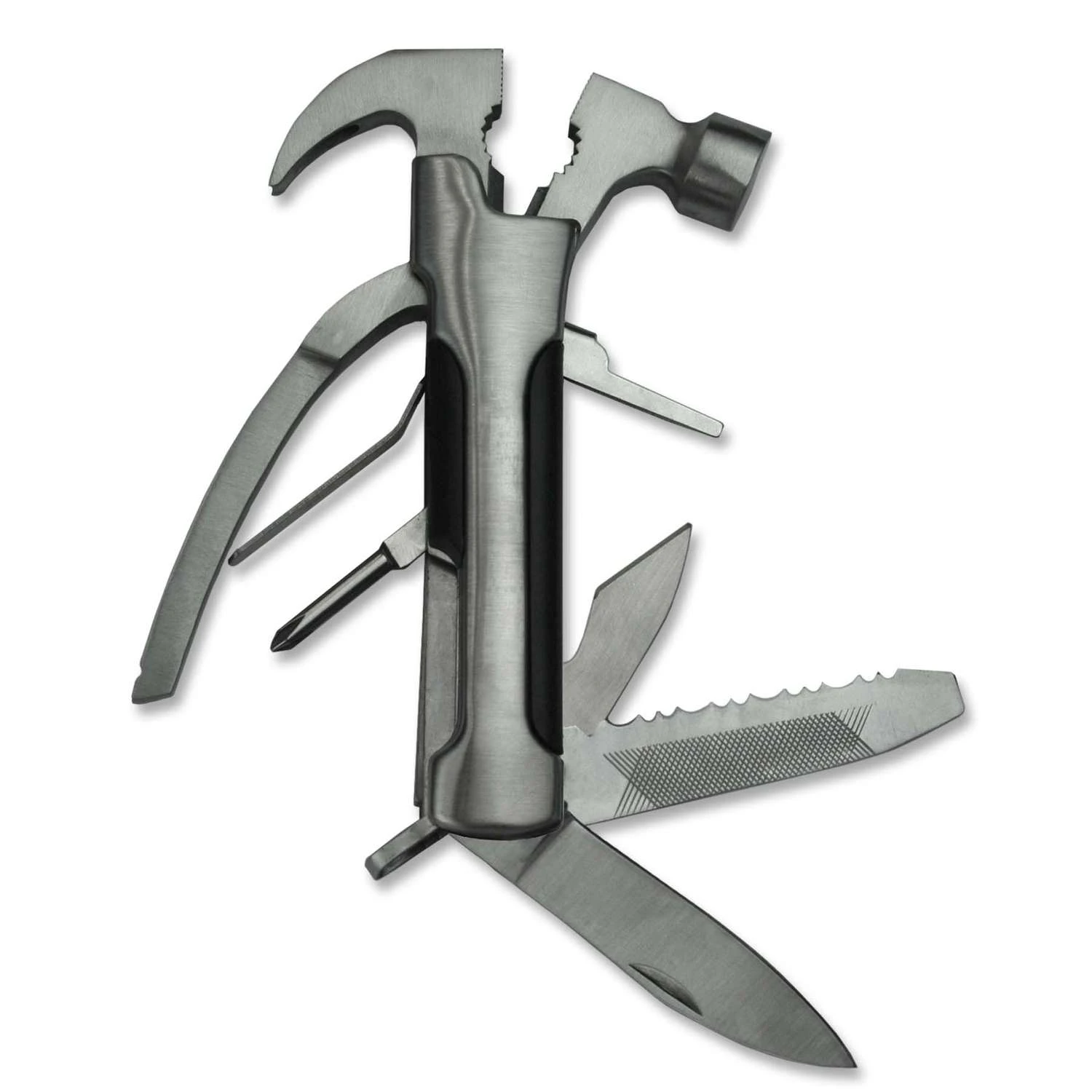The Hammer Time Multi-Tool combines 12 functions in 1 tool. Perfect for small home projects; keep it handy in your dashboard, kitchen or desk drawer. The handle is engraved with the phrase fortune favors the bold Hand-sharpened blades Functions hammer, pliers, wire cutters, multiple screwdrivers, 3 different knife blades, saw, file and more