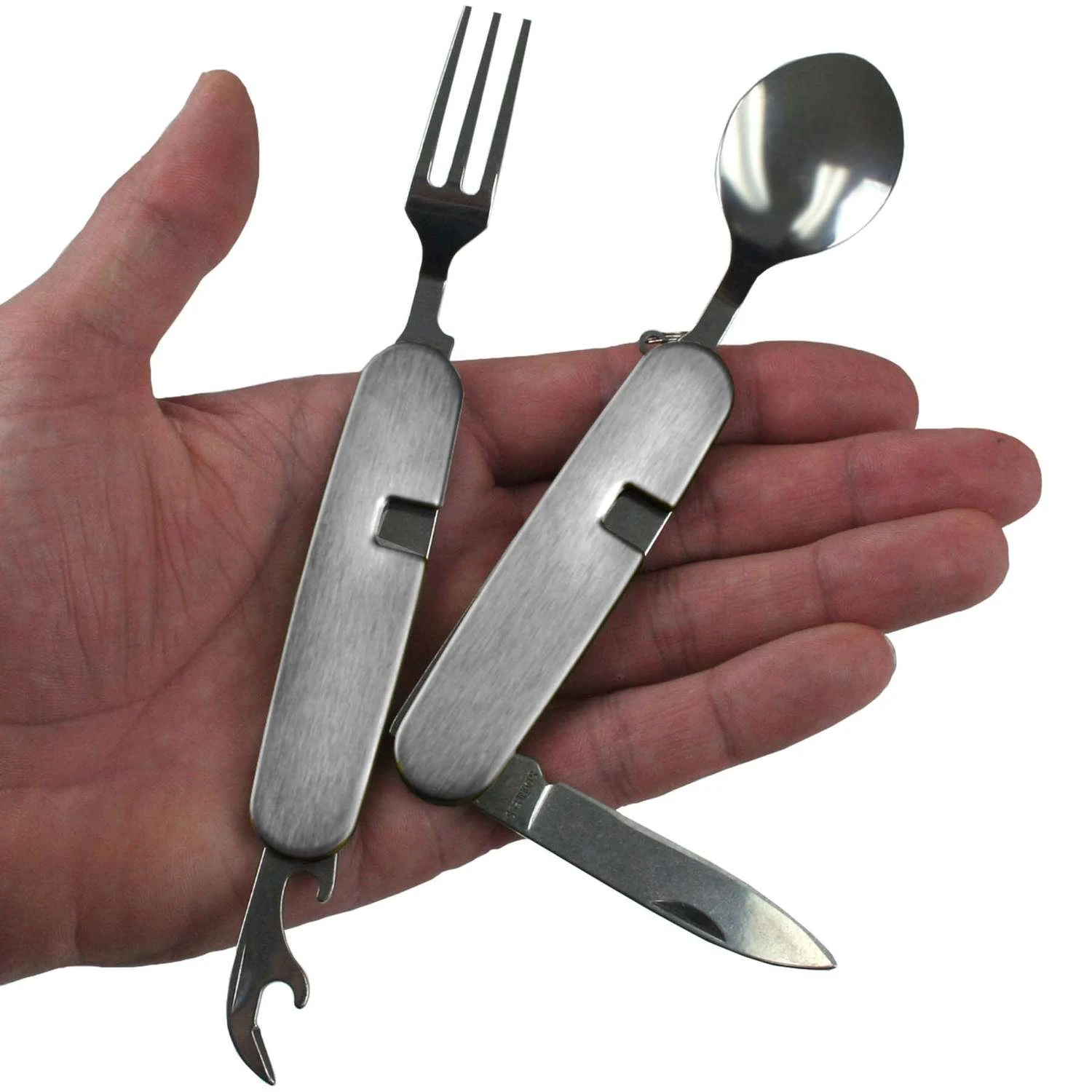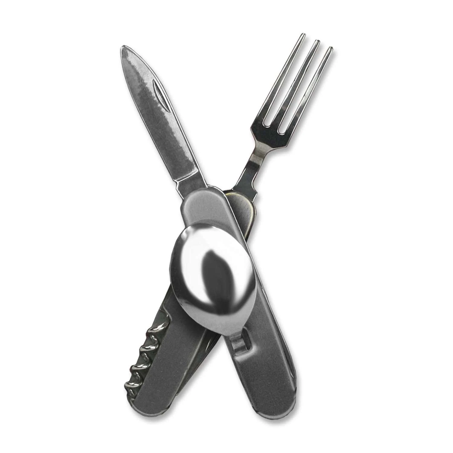 The Trixie & Milo genuine Hobo Knife is the perfect camping tool. This tool breaks into 2 separate pieces for use as flatware. 7 functions fork, spoon, knife, corkscrew, bottle opener, can opener and pick Perfect for biking, camping, backpacking, boating, picnics or lunch boxes Camping tool